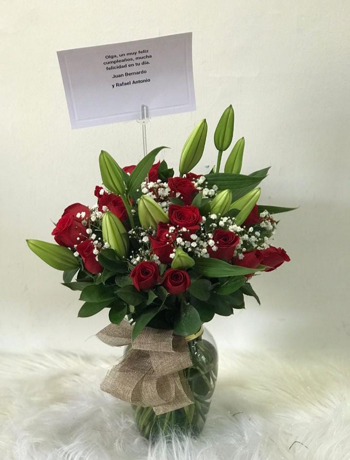 Este hermoso florero contiene una combinación perfecta de 24 rosas rojas y lirios, acompañadas por una carta dedicatoria personalizada. Sorprende a esa persona especial con estas flores que transmiten amor y elegancia. Ideal para cualquier ocasión.