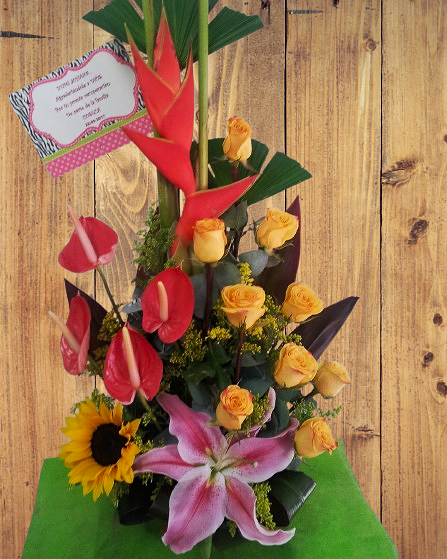 Nuestro Ikebana Tropical es una exquisita combinación de 9 rosas amarillas, anturios rojos, lirios rosados, girasol y follaje tropical, ideal para transmitir alegría, gratitud y afecto. Perfecto para cumpleaños, Día de la Madre o cualquier ocasión especial, este diseño elegante y vibrante es una explosión de naturaleza que ilumina cualquier espacio.