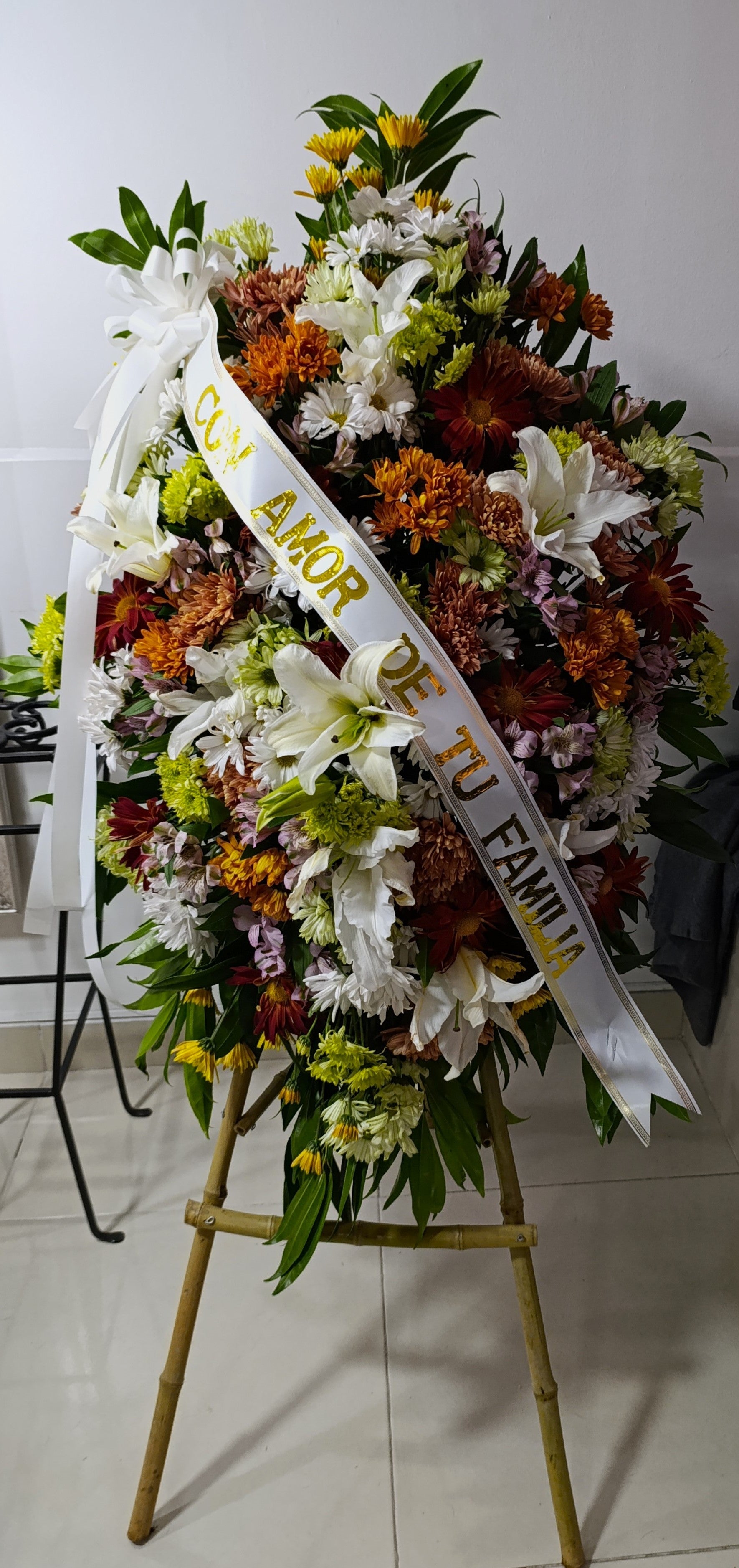 Este Pedestal Fúnebre con flores tropicales es una forma hermosa de honrar a tu ser querido. La cinta con mensaje personalizado añadirá un toque personal y cariñoso. Además, su trípode ofrece estabilidad y seguridad. Expresa tus condolencias con esta hermosa opción de flores.