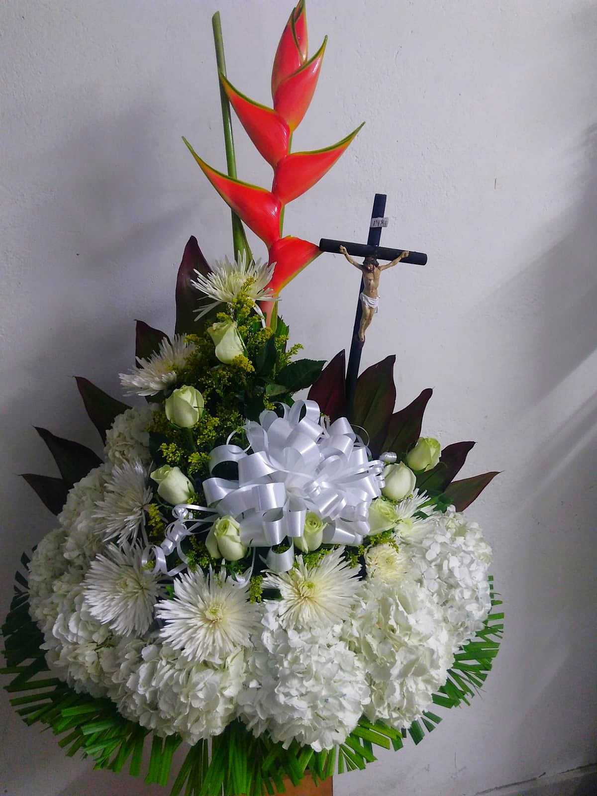 Nuestro Ramo Tradicional Fúnebre es un homenaje perfecto para despedir a un ser querido. Las hermosas rosas, fully y hortensias forman una media luna que simboliza el ciclo de la vida. Además, incluimos una estatua de cristo pequeña como símbolo de paz y consuelo.